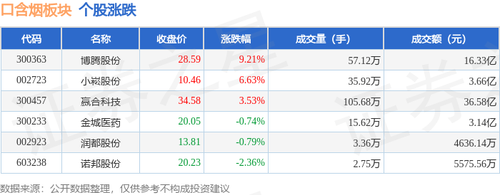 证券之星消息,9月15日口含烟板块较上一交易日上涨3.81%,博腾股份领涨。当日上证指数报收于3860.5,下跌0.26%。深证成指报收于13005.77,上涨0.63%。口含烟板块个股涨跌见下表: