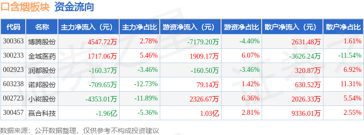从资金流向上来看,当日口含烟板块主力资金净流出1.86亿元,游资资金净流入7255.74万元,散户资金净流入1.13亿元。口含烟板块个股资金流向见下表:
