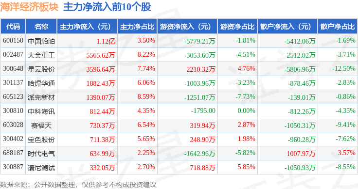 从资金流向上来看,当日海洋经济板块主力资金净流出11.46亿元,游资资金净流入391.68万元,散户资金净流入11.42亿元。海洋经济板块个股资金流向见下表: