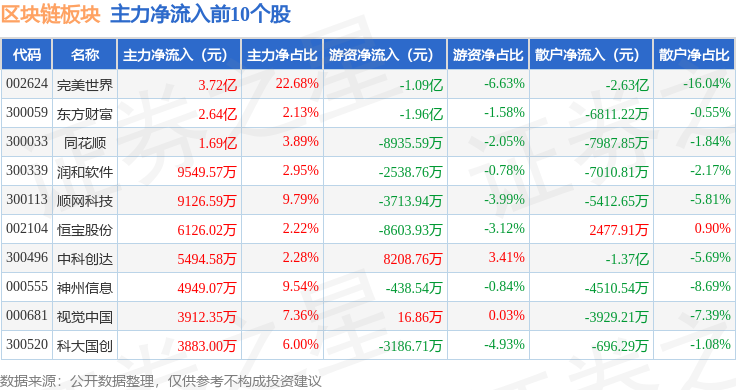 从资金流向上来看,当日区块链板块主力资金净流出68.09亿元,游资资金净流入13.69亿元,散户资金净流入54.4亿元。区块链板块个股资金流向见下表: