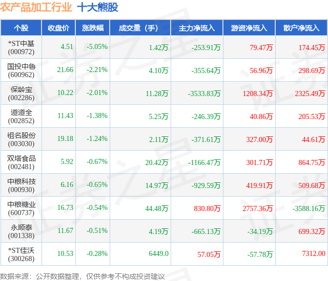 个股表现方面,农产品加工行业当日领跌股为*ST中基(000972),该股当日报收4.51,下跌5.05%,成交量1.42万,主力资金净流出253.91万元。国投中鲁(600962)以下跌2.21%紧随其后,该股当日成交量4.1万,主力资金净流出355.64万元。除此之外,保龄宝(002286)、道道全(002852)、祖名股份(003030)均进入当日熊股之列。具体个股列表见下表: