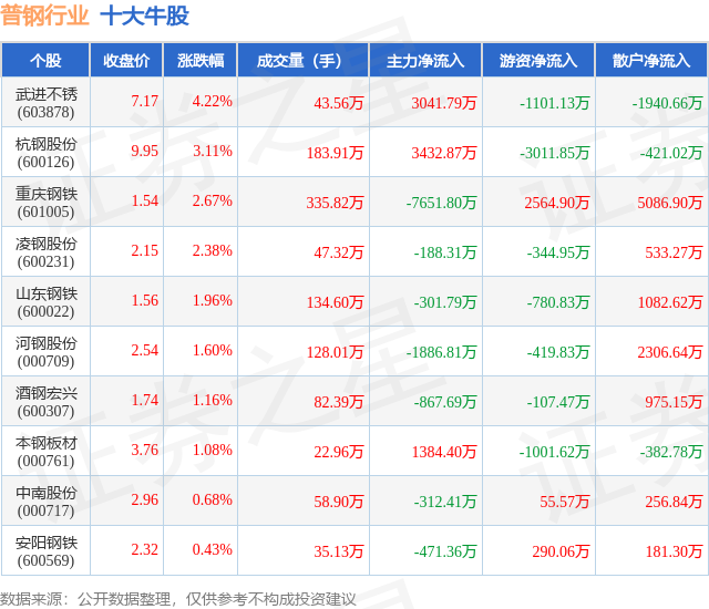 个股表现方面,普钢行业当日领涨股为武进不锈(603878),该股当日报收7.17,上涨4.22%,成交量43.56万,主力资金净流入3041.79万元。杭钢股份(600126)以上涨3.11%紧随其后,该股当日成交量183.91万,主力资金净流入3432.87万元。除此之外,重庆钢铁(601005)、凌钢股份(600231)、山东钢铁(600022)均进入当日牛股之列。具体个股列表见下表: