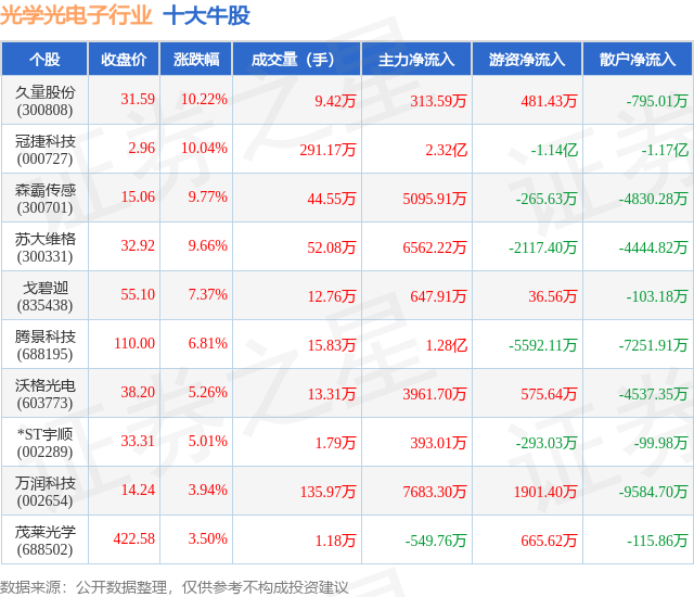 个股表现方面,光学光电子行业当日领涨股为久量股份(300808),该股当日报收31.59,上涨10.22%,成交量9.42万,主力资金净流入313.59万元。冠捷科技(000727)以上涨10.04%紧随其后,该股当日成交量291.17万,主力资金净流入2.32亿元。除此之外,森霸传感(300701)、苏大维格(300331)、戈碧迦(835438)均进入当日牛股之列。具体个股列表见下表: