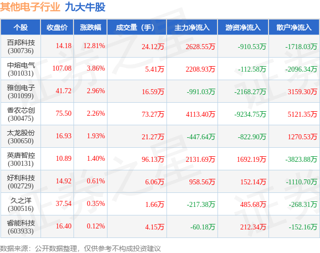 个股表现方面,其他电子行业当日领涨股为百邦科技(300736),该股当日报收14.18,上涨12.81%,成交量24.12万,主力资金净流入2628.55万元。中熔电气(301031)以上涨3.86%紧随其后,该股当日成交量5.41万,主力资金净流入2208.93万元。除此之外,雅创电子(301099)、香农芯创(300475)、太龙股份(300650)均进入当日牛股之列。具体个股列表见下表: