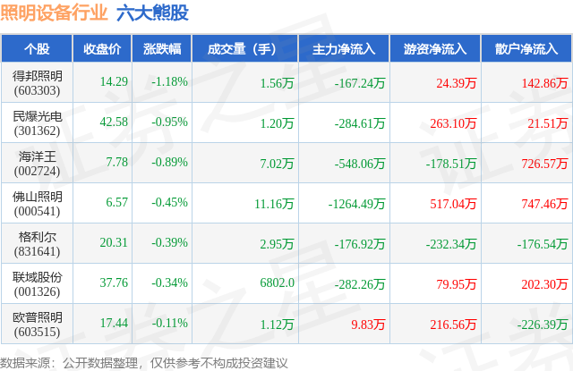 个股表现方面,照明设备行业当日领跌股为得邦照明(603303),该股当日报收14.29,下跌1.18%,成交量1.56万,主力资金净流出167.24万元。民爆光电(301362)以下跌0.95%紧随其后,该股当日成交量1.2万,主力资金净流出284.61万元。除此之外,海洋王(002724)、佛山照明(000541)、格利尔(831641)均进入当日熊股之列。具体个股列表见下表: