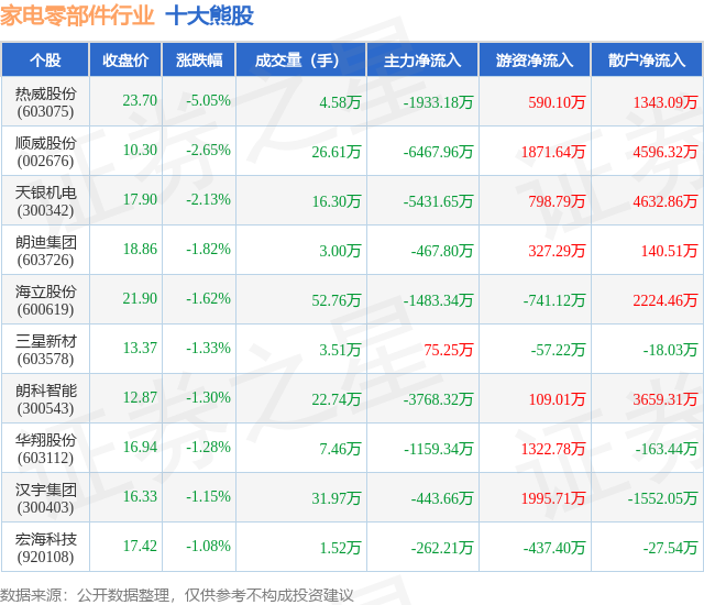 个股表现方面,家电零部件行业当日领跌股为热威股份(603075),该股当日报收23.7,下跌5.05%,成交量4.58万,主力资金净流出1933.18万元。顺威股份(002676)以下跌2.65%紧随其后,该股当日成交量26.61万,主力资金净流出6467.96万元。除此之外,天银机电(300342)、朗迪集团(603726)、海立股份(600619)均进入当日熊股之列。具体个股列表见下表: