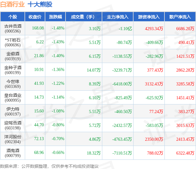 个股表现方面,白酒行业当日领跌股为古井贡酒(000596),该股当日报收168.08,下跌1.48%,成交量3.1万,主力资金净流出1.1亿元。*ST岩石(600696)以下跌1.43%紧随其后,该股当日成交量5.51万,主力资金净流出80.74万元。除此之外,金徽酒(603919)、金种子酒(600199)、今世缘(603369)均进入当日熊股之列。具体个股列表见下表:
