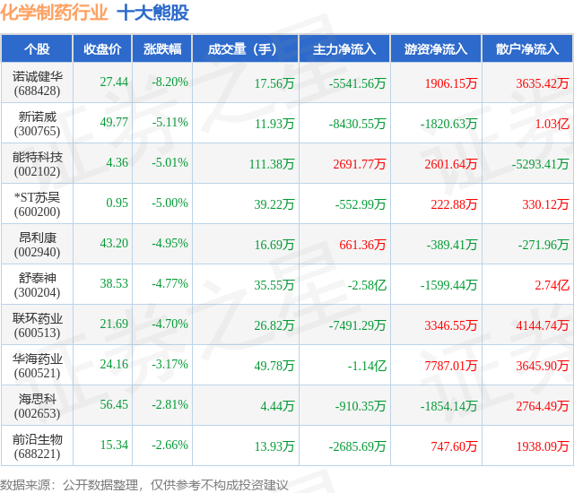 个股表现方面,化学制药行业当日领跌股为诺诚健华(688428),该股当日报收27.44,下跌8.2%,成交量17.56万,主力资金净流出5541.56万元。新诺威(300765)以下跌5.11%紧随其后,该股当日成交量11.93万,主力资金净流出8430.55万元。除此之外,能特科技(002102)、*ST苏吴(600200)、昂利康(002940)均进入当日熊股之列。具体个股列表见下表: