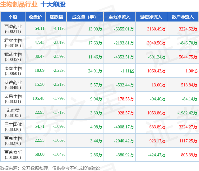 个股表现方面,生物制品行业当日领跌股为西藏药业(600211),该股当日报收54.11,下跌4.11%,成交量13.9万,主力资金净流出6355.01万元。君实生物(688180)以下跌2.81%紧随其后,该股当日成交量17.63万,主力资金净流出2193.81万元。除此之外,我武生物(300357)、康泰生物(300601)、艾迪药业(688488)均进入当日熊股之列。具体个股列表见下表: