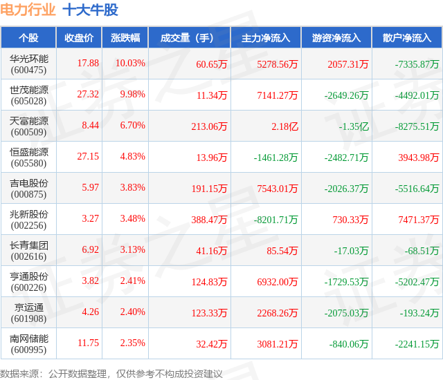 个股表现方面,电力行业当日领涨股为华光环能(600475),该股当日报收17.88,上涨10.03%,成交量60.65万,主力资金净流入5278.56万元。世茂能源(605028)以上涨9.98%紧随其后,该股当日成交量11.34万,主力资金净流入7141.27万元。除此之外,天富能源(600509)、恒盛能源(605580)、吉电股份(000875)均进入当日牛股之列。具体个股列表见下表: