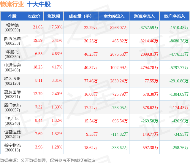 个股表现方面,物流行业当日领涨股为福然德(605050),该股当日报收21.65,上涨7.5%,成交量22.29万,主力资金净流入8268.07万元。圆通速递(600233)以上涨6.41%紧随其后,该股当日成交量30.23万,主力资金净流入465.82万元。除此之外,华鹏飞(300350)、申通快递(002468)、韵达股份(002120)均进入当日牛股之列。具体个股列表见下表: