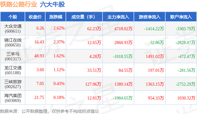 个股表现方面,铁路公路行业当日领涨股为大众交通(600611),该股当日报收6.26,上涨2.62%,成交量62.23万,主力资金净流入4718.02万元。锦江在线(600650)以上涨2.37%紧随其后,该股当日成交量12.65万,主力资金净流入2860.93万元。除此之外,三羊马(001317)、龙江交通(601188)、三峡旅游(002627)均进入当日牛股之列。具体个股列表见下表: