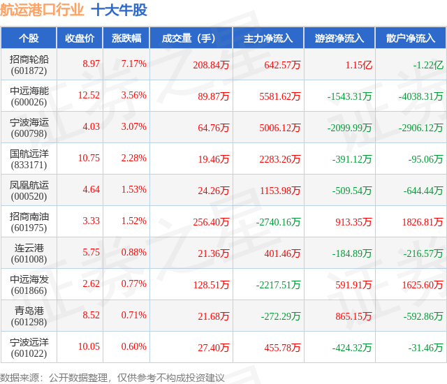 个股表现方面,航运港口行业当日领涨股为招商轮船(601872),该股当日报收8.97,上涨7.17%,成交量208.84万,主力资金净流入642.57万元。中远海能(600026)以上涨3.56%紧随其后,该股当日成交量89.87万,主力资金净流入5581.62万元。除此之外,宁波海运(600798)、国航远洋(833171)、凤凰航运(000520)均进入当日牛股之列。具体个股列表见下表: