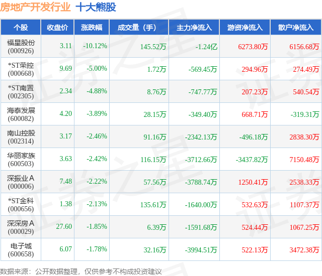 个股表现方面,房地产开发行业当日领跌股为福星股份(000926),该股当日报收3.11,下跌10.12%,成交量145.52万,主力资金净流出1.24亿元。*ST荣控(000668)以下跌5.0%紧随其后,该股当日成交量1.72万,主力资金净流出569.45万元。除此之外,*ST南置(002305)、海泰发展(600082)、南山控股(002314)均进入当日熊股之列。具体个股列表见下表: