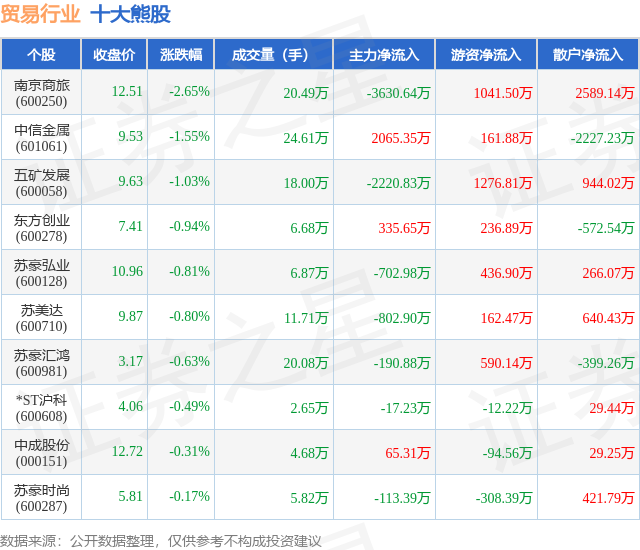 个股表现方面,贸易行业当日领跌股为南京商旅(600250),该股当日报收12.51,下跌2.65%,成交量20.49万,主力资金净流出3630.64万元。中信金属(601061)以下跌1.55%紧随其后,该股当日成交量24.61万,主力资金净流入2065.35万元。除此之外,五矿发展(600058)、东方创业(600278)、苏豪弘业(600128)均进入当日熊股之列。具体个股列表见下表: