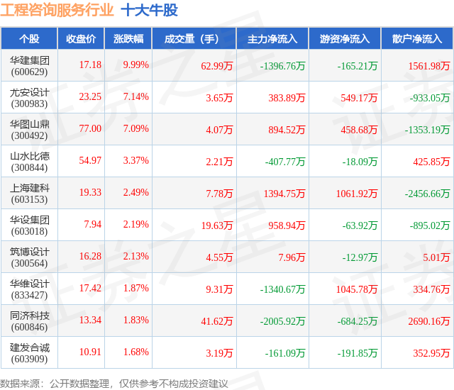 个股表现方面,工程咨询服务行业当日领涨股为华建集团(600629),该股当日报收17.18,上涨9.99%,成交量62.99万,主力资金净流出1396.76万元。尤安设计(300983)以上涨7.14%紧随其后,该股当日成交量3.65万,主力资金净流入383.89万元。除此之外,华图山鼎(300492)、山水比德(300844)、上海建科(603153)均进入当日牛股之列。具体个股列表见下表: