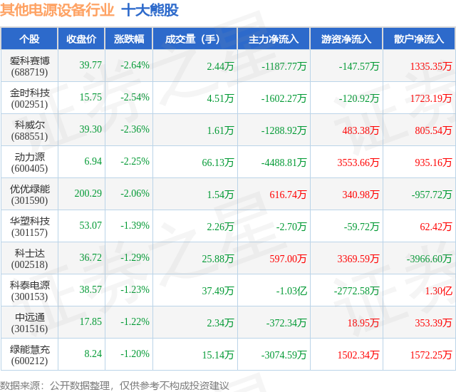 个股表现方面,其他电源设备行业当日领跌股为爱科赛博(688719),该股当日报收39.77,下跌2.64%,成交量2.44万,主力资金净流出1187.77万元。金时科技(002951)以下跌2.54%紧随其后,该股当日成交量4.51万,主力资金净流出1602.27万元。除此之外,科威尔(688551)、动力源(600405)、优优绿能(301590)均进入当日熊股之列。具体个股列表见下表: