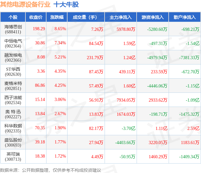 个股表现方面,其他电源设备行业当日领涨股为海博思创(688411),该股当日报收198.29,上涨8.65%,成交量7.26万,主力资金净流入5978.8万元。中恒电气(002364)以上涨7.34%紧随其后,该股当日成交量84.54万,主力资金净流入1.59亿元。除此之外,融发核电(002366)、ST华西(002630)、麦格米特(002851)均进入当日牛股之列。具体个股列表见下表: