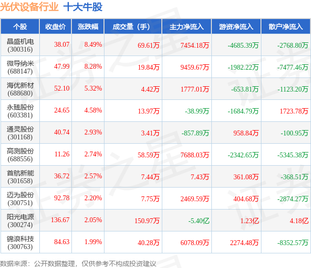 个股表现方面,光伏设备行业当日领涨股为晶盛机电(300316),该股当日报收38.07,上涨8.49%,成交量69.61万,主力资金净流入7454.18万元。微导纳米(688147)以上涨8.28%紧随其后,该股当日成交量19.84万,主力资金净流入9459.67万元。除此之外,海优新材(688680)、永臻股份(603381)、通灵股份(301168)均进入当日牛股之列。具体个股列表见下表:
