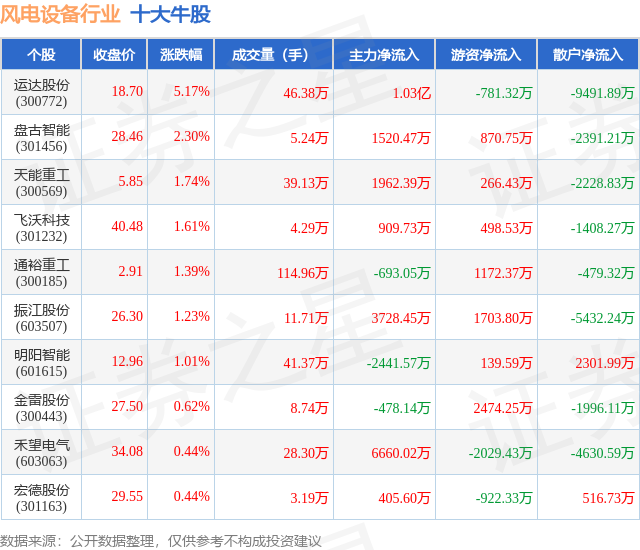 个股表现方面,风电设备行业当日领涨股为运达股份(300772),该股当日报收18.7,上涨5.17%,成交量46.38万,主力资金净流入1.03亿元。盘古智能(301456)以上涨2.3%紧随其后,该股当日成交量5.24万,主力资金净流入1520.47万元。除此之外,天能重工(300569)、飞沃科技(301232)、通裕重工(300185)均进入当日牛股之列。具体个股列表见下表: