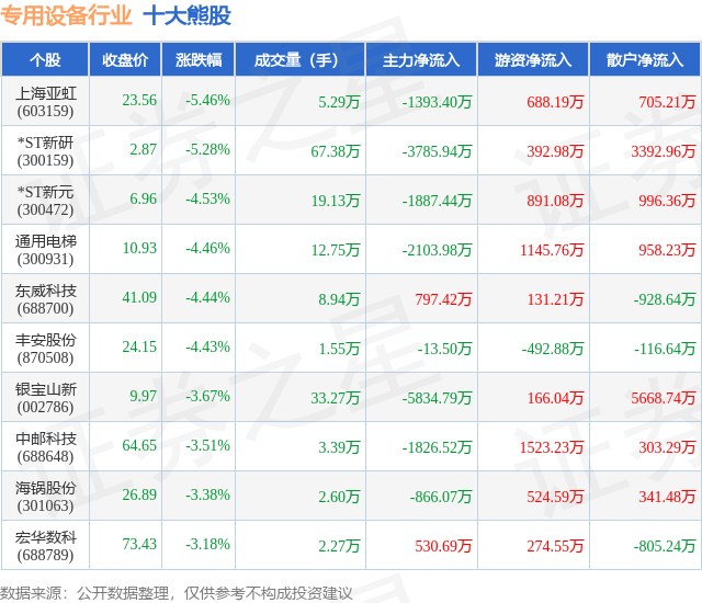 个股表现方面,专用设备行业当日领跌股为上海亚虹(603159),该股当日报收23.56,下跌5.46%,成交量5.29万,主力资金净流出1393.4万元。*ST新研(300159)以下跌5.28%紧随其后,该股当日成交量67.38万,主力资金净流出3785.94万元。除此之外,*ST新元(300472)、通用电梯(300931)、东威科技(688700)均进入当日熊股之列。具体个股列表见下表: