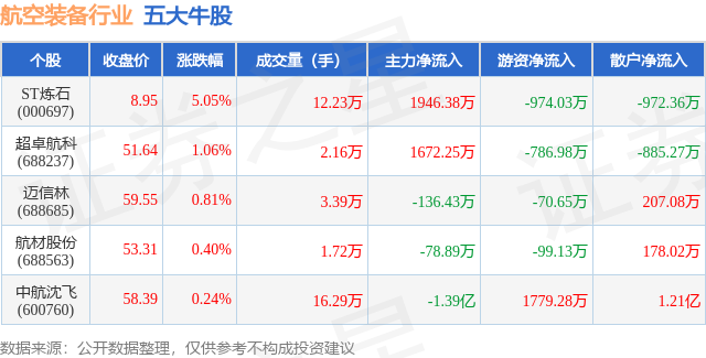 个股表现方面,航空装备行业当日领涨股为ST炼石(000697),该股当日报收8.95,上涨5.05%,成交量12.23万,主力资金净流入1946.38万元。超卓航科(688237)以上涨1.06%紧随其后,该股当日成交量2.16万,主力资金净流入1672.25万元。除此之外,迈信林(688685)、航材股份(688563)、中航沈飞(600760)均进入当日牛股之列。具体个股列表见下表: