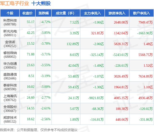 个股表现方面,军工电子行业当日领跌股为科思科技(688788),该股当日报收55.17,下跌4.72%,成交量7.52万,主力资金净流出1.06亿元。新光光电(688011)以下跌3.85%紧随其后,该股当日成交量3.39万,主力资金净流入321.85万元。除此之外,金信诺(300252)、睿创微纳(688002)、华力创通(300045)均进入当日熊股之列。具体个股列表见下表: