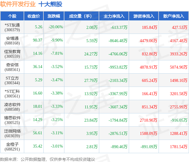 个股表现方面,软件开发行业当日领跌股为*ST东通(300379),该股当日报收5.26,下跌20.06%,成交量2.08万,主力资金净流出613.37万元。安博通(688168)以下跌9.9%紧随其后,该股当日成交量5.59万,主力资金净流出8646.48万元。除此之外,佳发教育(300559)、奇安信(688561)、ST立方(300344)均进入当日熊股之列。具体个股列表见下表: