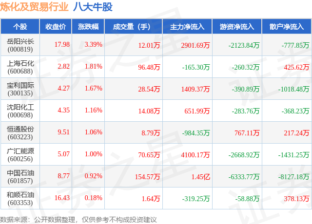 个股表现方面,炼化及贸易行业当日领涨股为岳阳兴长(000819),该股当日报收17.98,上涨3.39%,成交量12.01万,主力资金净流入2901.69万元。上海石化(600688)以上涨1.81%紧随其后,该股当日成交量96.48万,主力资金净流出165.3万元。除此之外,宝利国际(300135)、沈阳化工(000698)、恒通股份(603223)均进入当日牛股之列。具体个股列表见下表: