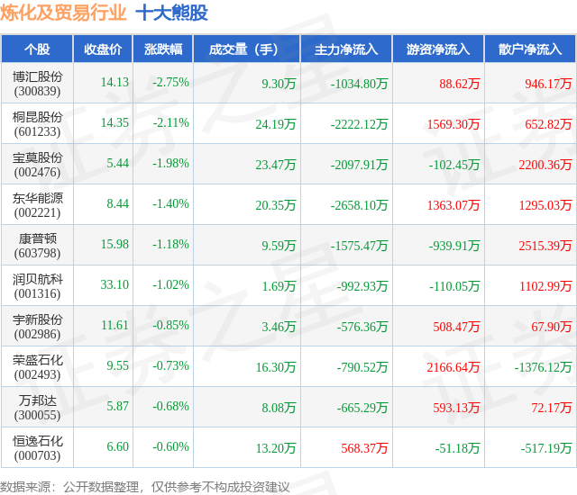 个股表现方面,炼化及贸易行业当日领跌股为博汇股份(300839),该股当日报收14.13,下跌2.75%,成交量9.3万,主力资金净流出1034.8万元。桐昆股份(601233)以下跌2.11%紧随其后,该股当日成交量24.19万,主力资金净流出2222.12万元。除此之外,宝莫股份(002476)、东华能源(002221)、康普顿(603798)均进入当日熊股之列。具体个股列表见下表: