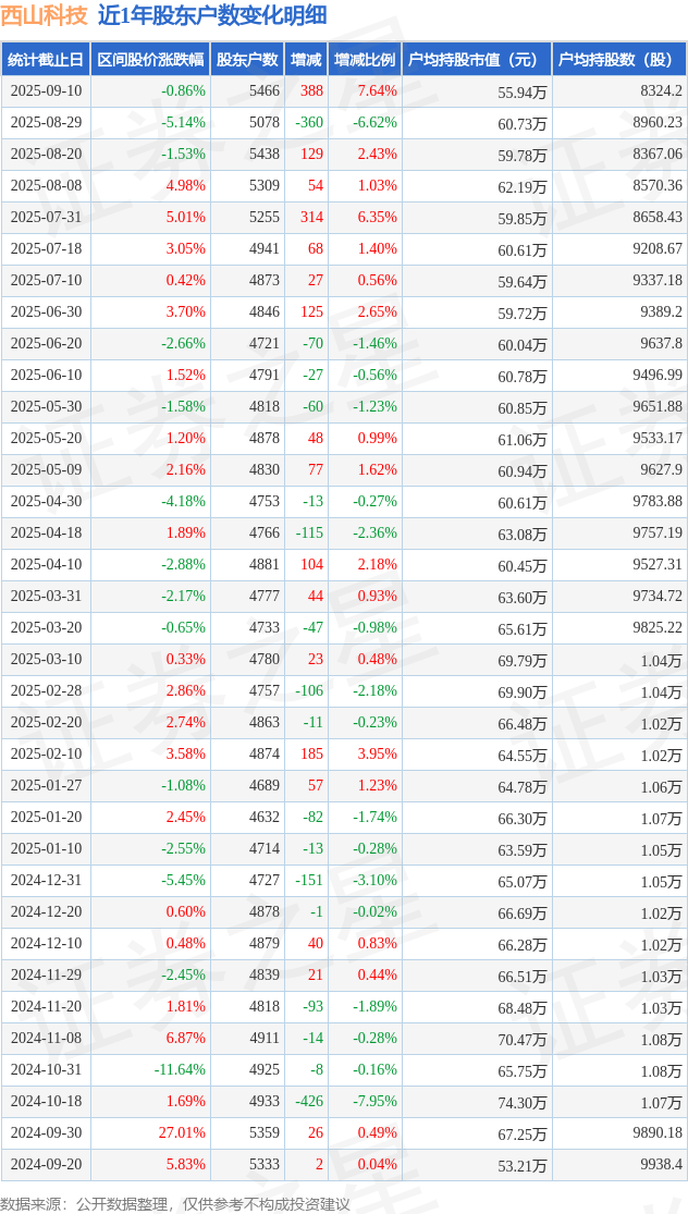 证券之星消息,近日西山科技披露,截至2025年9月10日公司股东户数为5466.0户,较8月29日增加388.0户,增幅为7.64%。户均持股数量由上期的8960.0股减少至8324.0股,户均持股市值为55.94万元。