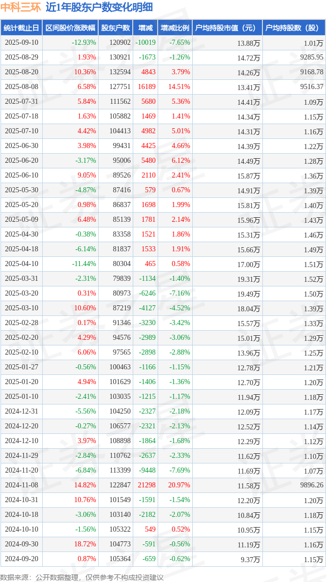 从股价来看,2025年8月29日至2025年9月10日,中科三环区间跌幅为12.93%,在此期间股东户数减少1.0万户,减幅为7.65%。