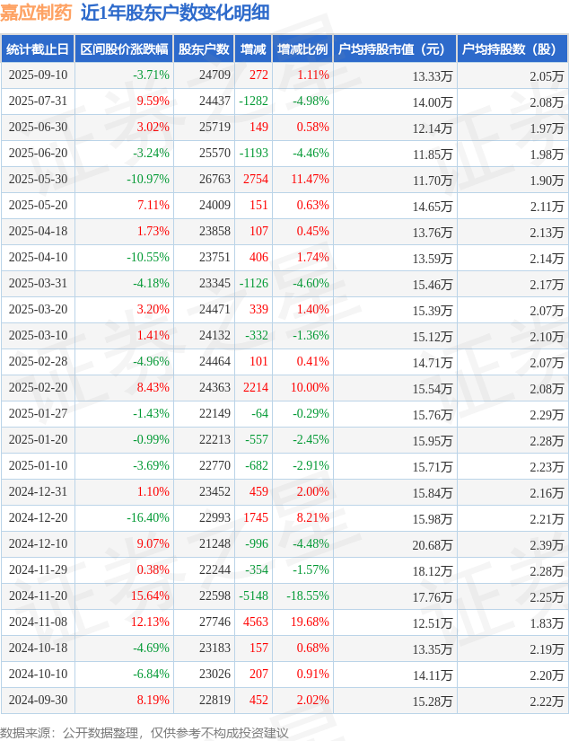 从股价来看,2025年7月31日至2025年9月10日,嘉应制药区间跌幅为3.71%,在此期间股东户数增加272.0户,增幅为1.11%。