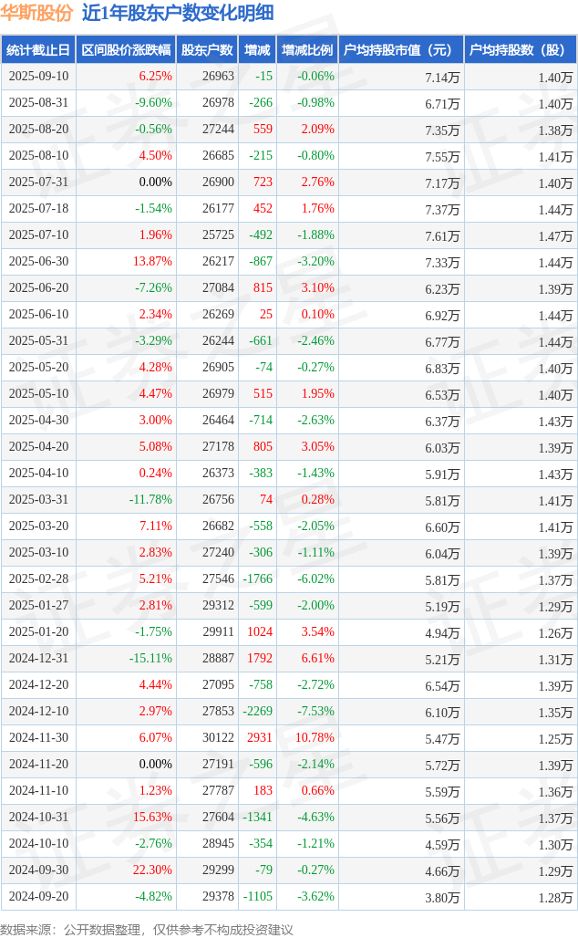 从股价来看,2025年8月31日至2025年9月10日,华斯股份区间涨幅为6.25%,在此期间股东户数减少15.0户,减幅为0.06%。