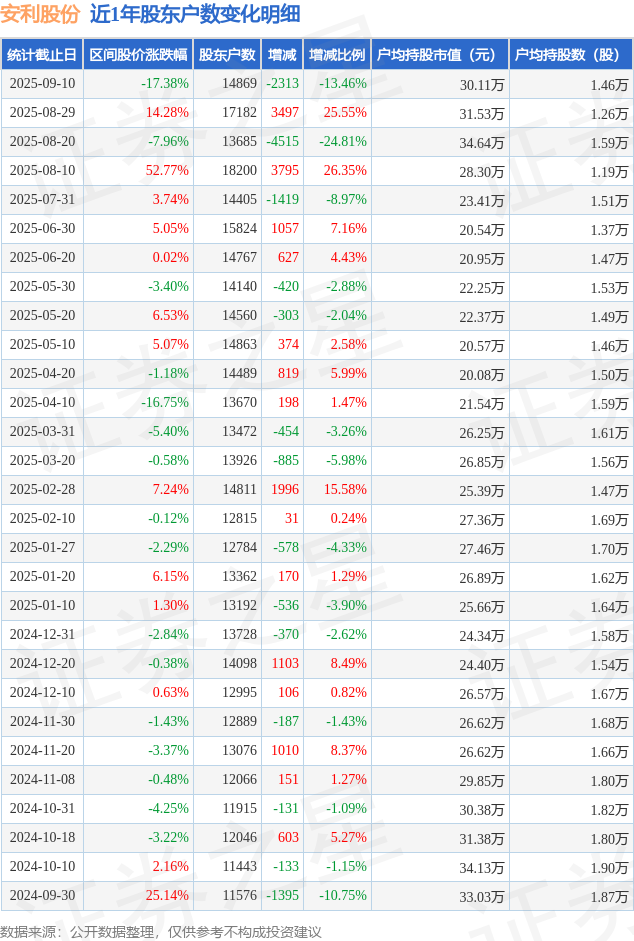 从股价来看,2025年8月29日至2025年9月10日,安利股份区间跌幅为17.38%,在此期间股东户数减少2313.0户,减幅为13.46%。
