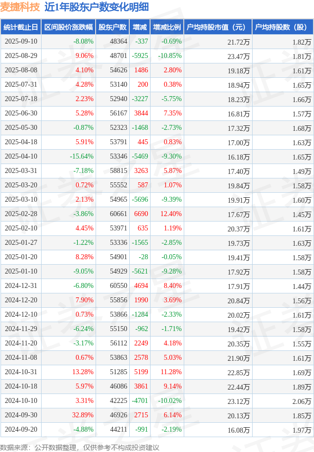 从股价来看,2025年8月29日至2025年9月10日,麦捷科技区间跌幅为8.08%,在此期间股东户数减少337.0户,减幅为0.69%。
