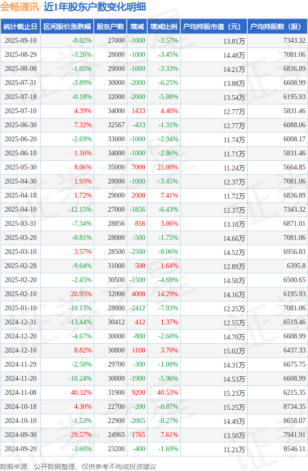从股价来看,2025年8月29日至2025年9月10日,会畅通讯区间跌幅为8.02%,在此期间股东户数减少1000.0户,减幅为3.57%。