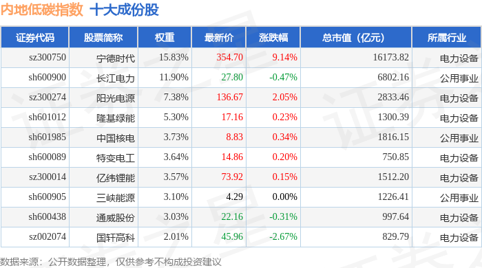 证券之星消息,9月15日,内地低碳(000977)指数报收于1958.98点,涨1.89%,成交1284.23亿元,换手率1.36%。当日该指数成份股中,上涨的有29家,湖南裕能以10.77%的涨幅领涨,下跌的有19家,中国宝安以4.13%的跌幅领跌。