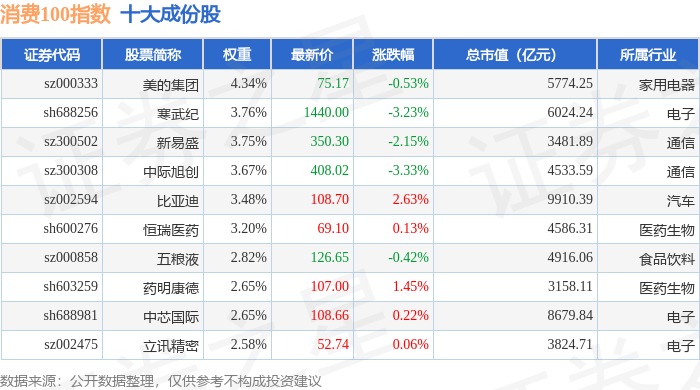 证券之星消息,9月15日,消费100(399364)指数报收于10831.5点,跌0.16%,成交3155.73亿元,换手率1.81%。当日该指数成份股中,上涨的有46家,拓普集团以6.75%的涨幅领涨,下跌的有54家,沪电股份以4.12%的跌幅领跌。