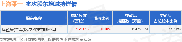 证券之星消息,9月15日上海莱士发布公告《上海莱士:关于控股股东增持公司股份计划实施完成的公告》,其股东海盈康(青岛)医疗科技有限公司于2025年8月22日至2025年9月15日间合计增持4649.45万股,占公司目前总股本的0.7004%,变动期间该股股价下跌1.72%,截止9月15日收盘报6.84元。