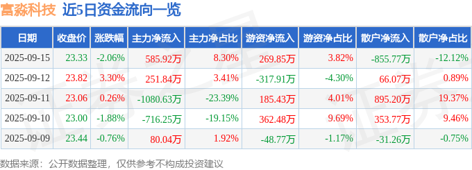 证券之星消息,截至2025年9月15日收盘,富淼科技(688350)报收于23.33元,下跌2.06%,换手率2.45%,成交量3.0万手,成交额7058.76万元。