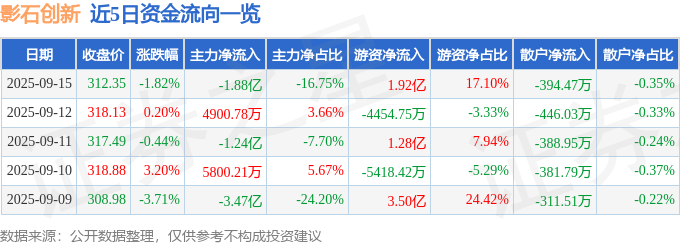 证券之星消息,截至2025年9月15日收盘,影石创新(688775)报收于312.35元,下跌1.82%,换手率11.91%,成交量3.63万手,成交额11.22亿元。