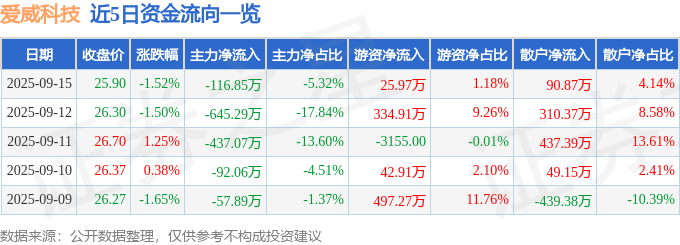9月15日的资金流向数据方面,主力资金净流出116.85万元,占总成交额5.32%,游资资金净流入25.97万元,占总成交额1.18%,散户资金净流入90.87万元,占总成交额4.14%。