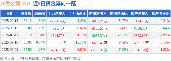 证券之星消息,截至2025年9月15日收盘,九号公司(689009)报收于66.13元,下跌1.3%,换手率2.46%,成交量13.7万手,成交额9.13亿元。