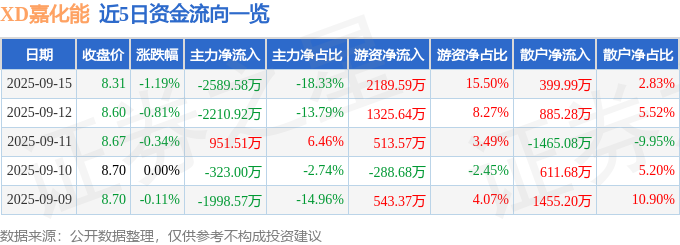 证券之星消息,截至2025年9月15日收盘,XD嘉化能(600273)报收于8.31元,下跌1.19%,换手率1.25%,成交量16.91万手,成交额1.41亿元。