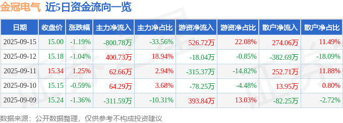 9月15日的资金流向数据方面,主力资金净流出800.78万元,占总成交额33.56%,游资资金净流入526.72万元,占总成交额22.08%,散户资金净流入274.06万元,占总成交额11.49%。