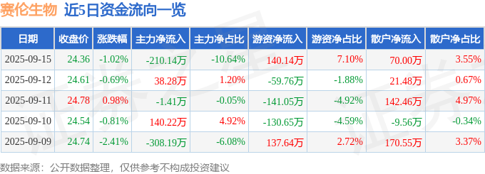 证券之星消息,截至2025年9月15日收盘,赛伦生物(688163)报收于24.36元,下跌1.02%,换手率0.75%,成交量8087.0手,成交额1974.47万元。