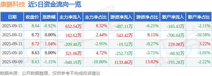 证券之星消息,截至2025年9月15日收盘,康鹏科技(688602)报收于8.64元,下跌0.92%,换手率3.49%,成交量9.05万手,成交额7846.02万元。