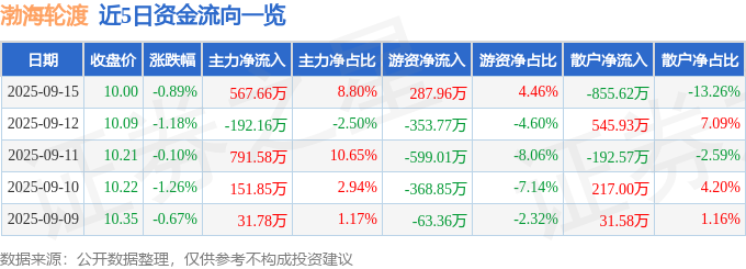 证券之星消息,截至2025年9月15日收盘,渤海轮渡(603167)报收于10.0元,下跌0.89%,换手率1.38%,成交量6.45万手,成交额6452.21万元。