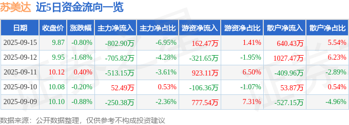 9月15日的资金流向数据方面,主力资金净流出802.9万元,占总成交额6.95%,游资资金净流入162.47万元,占总成交额1.41%,散户资金净流入640.43万元,占总成交额5.54%。